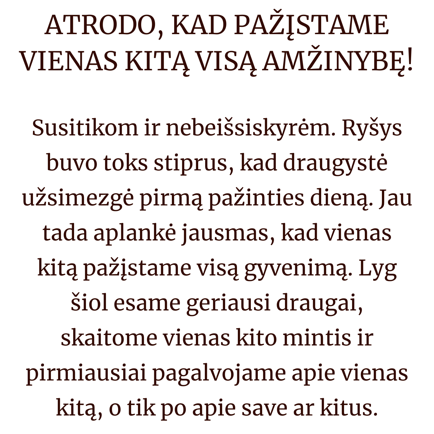 Susitikom ir nebeišsiskyrėm. Ryšys buvo toks stiprus, kad draugystė užsimezgė pirmą pažinties dieną. Jau tada aplankė jausmas, kad vienas kitą pažįstame visą gyvenimą. Lyg šiol esame geriausi draugai, skaitome vienas kito mintis ir pirmiausiai pagalvojame apie vienas kitą.
