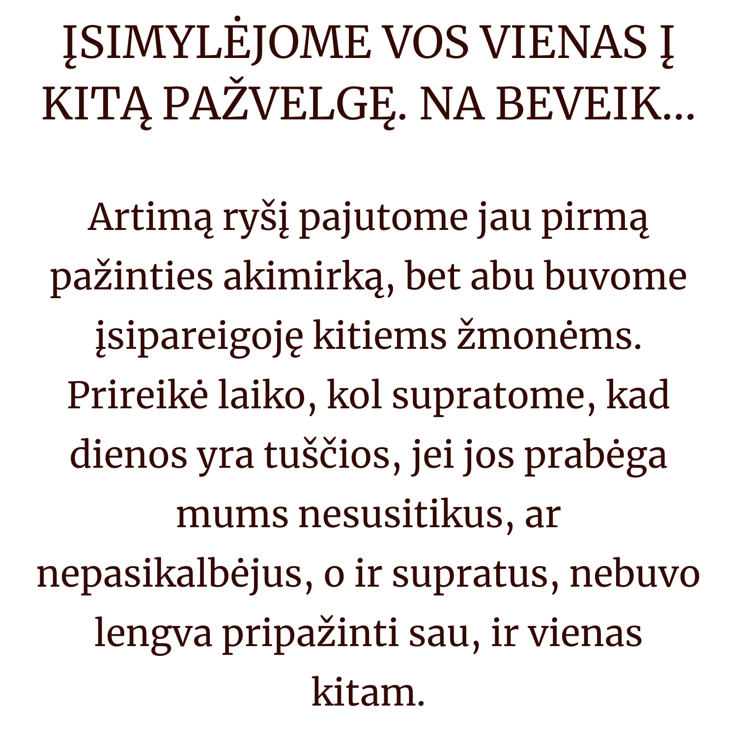 Artimą ryšį pajutome jau pirmą pažinties akimirką, bet abu buvome įsipareigoję kitiems žmonėms. Prireikė laiko, kol supratome, kad dienos yra tuščios, jei jos prabėga mums nesusitikus, ar nepasikalbėjus, o ir supratus, nebuvo lengva pripažinti sau, ir vienas kitam.