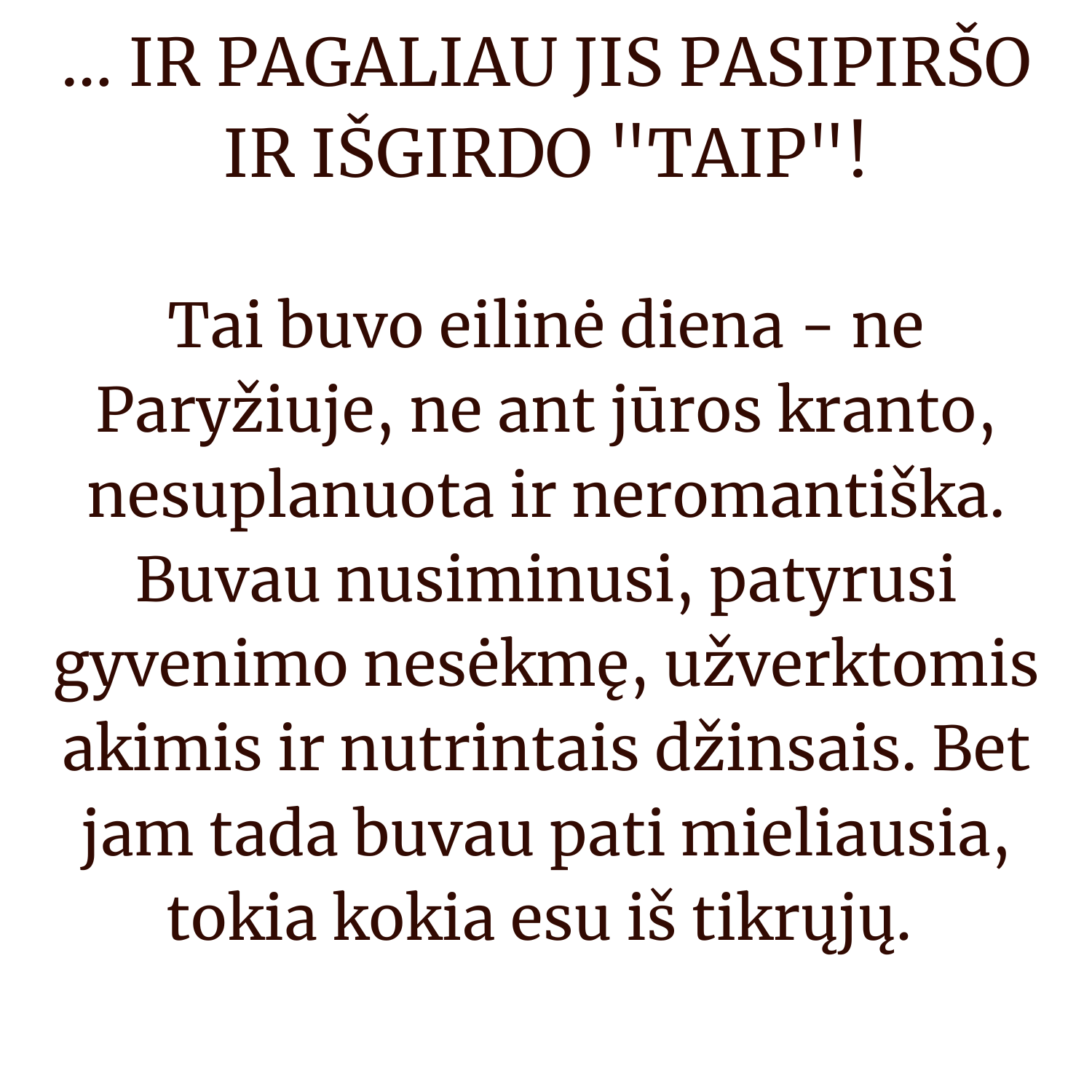 Tai buvo eilinė diena – ne Paryžiuje, ne ant jūros kranto, nesuplanuota ir neromantiška. Buvau nusiminusi, patyrusi gyvenimo nesėkmę, užverktomis akimis ir nutrintais džinsais. Bet jam tada buvau pati mieliausia, tokia kokia esu iš tikrųjų.